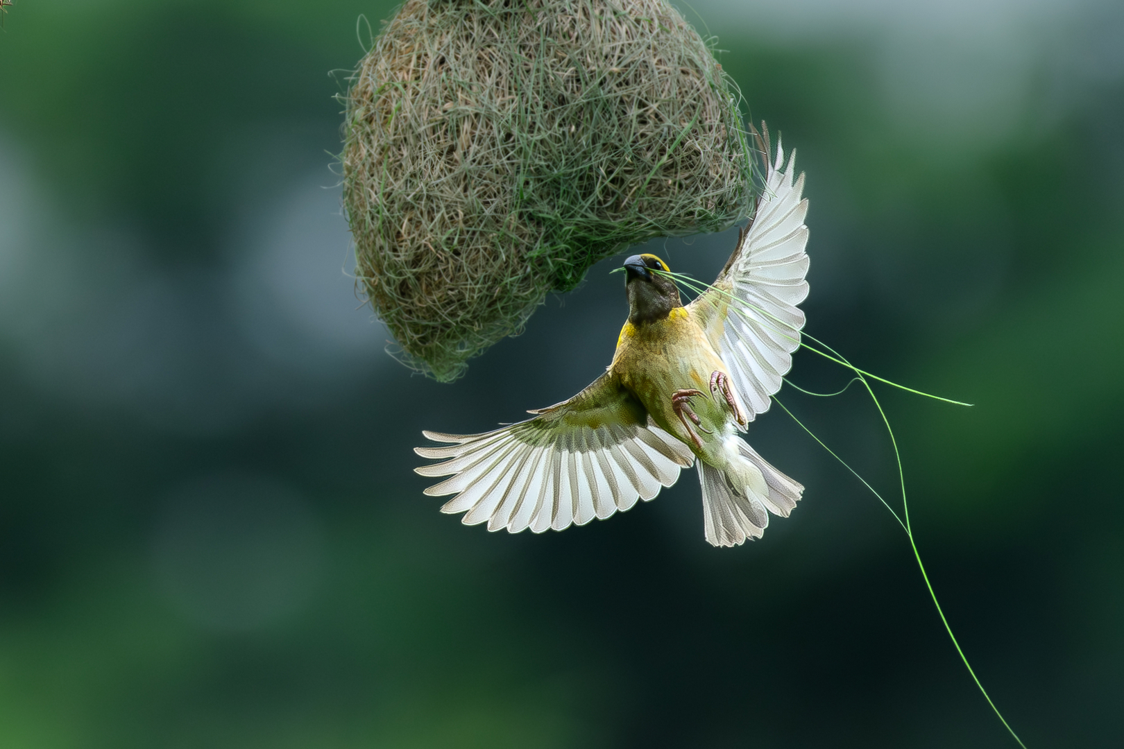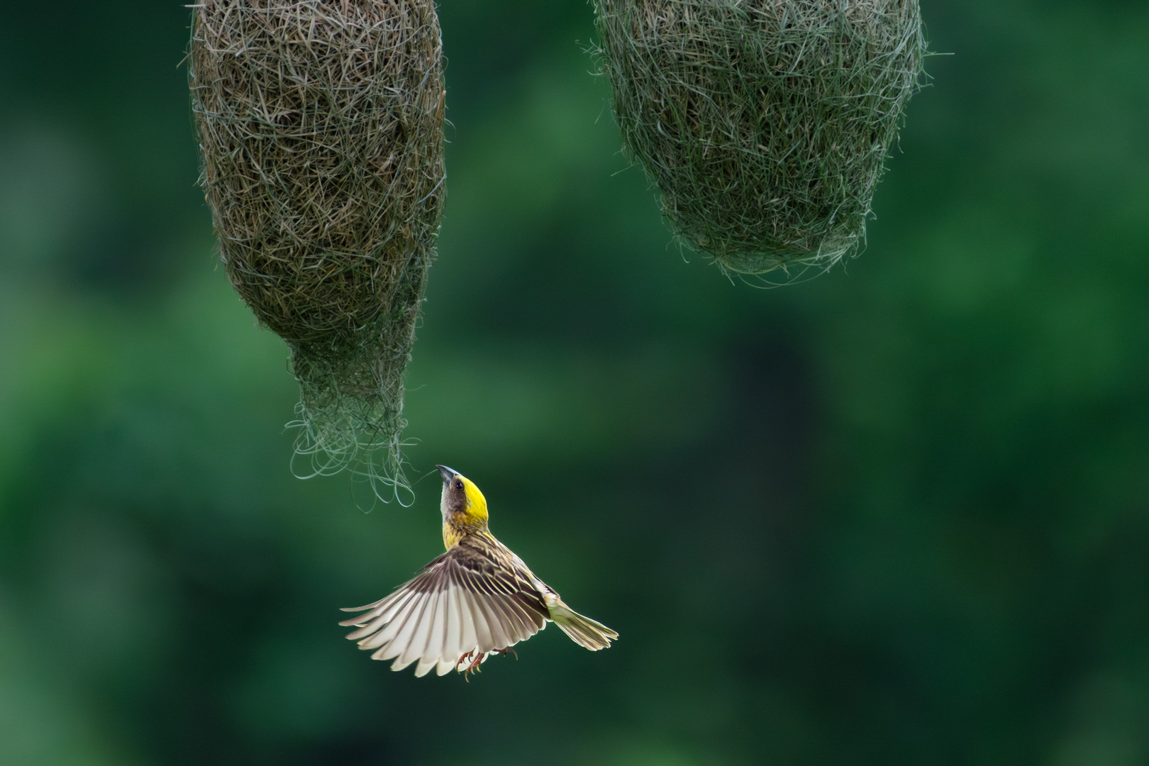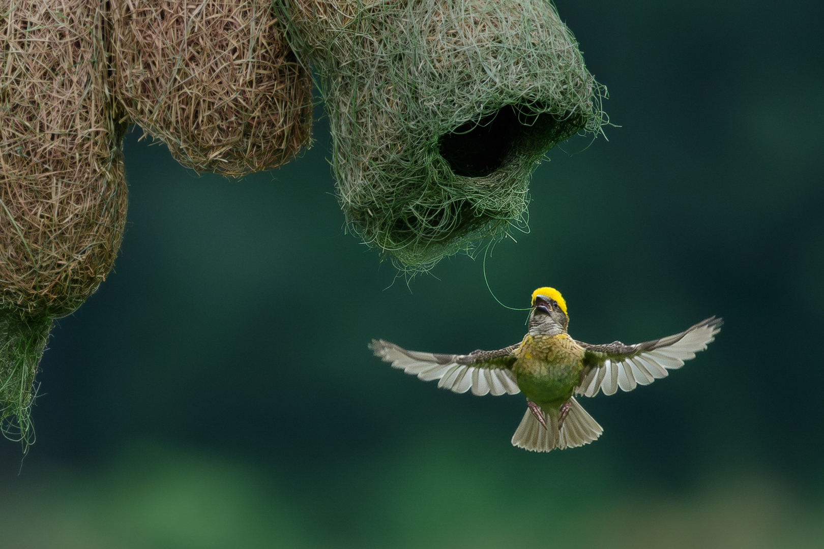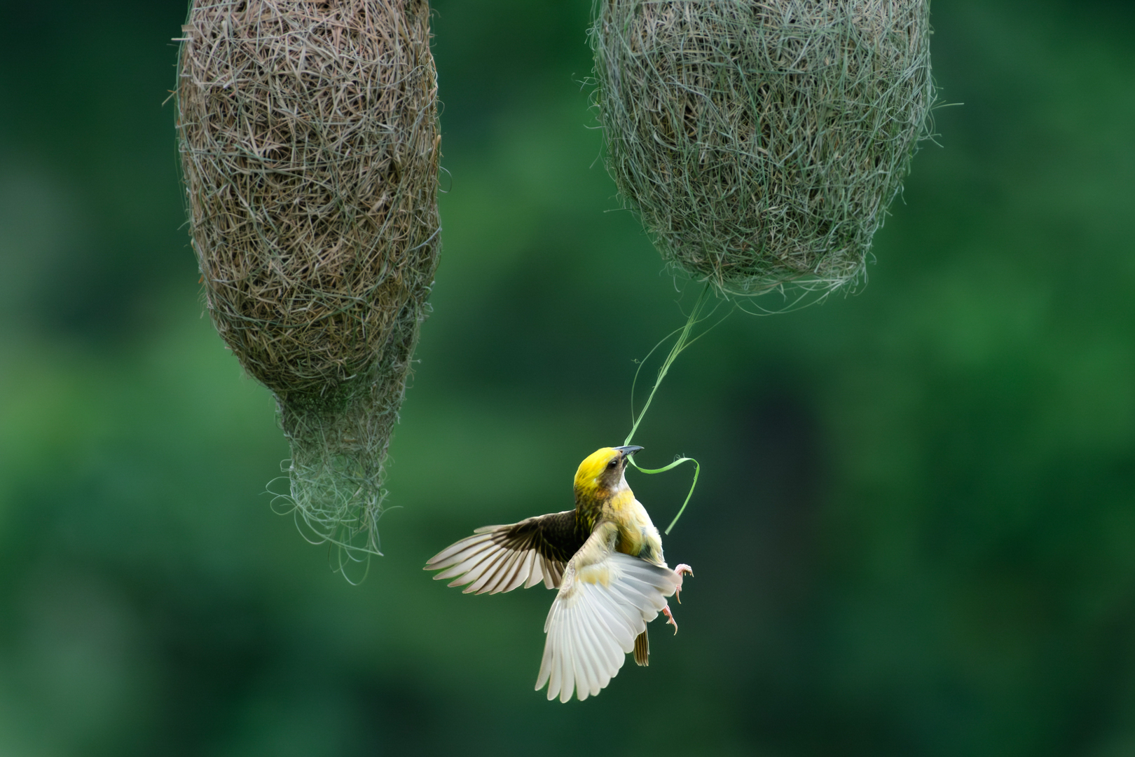 Baya Weaver is known for crafting the finest hanging nests, intricately woven with grass, leaves and soil for stability. Males build these elaborate structures to attract females, who judge the craftsmanship before selecting a mate. Capturing these small, swift birds in mid-air during nest building is extremely challenging.