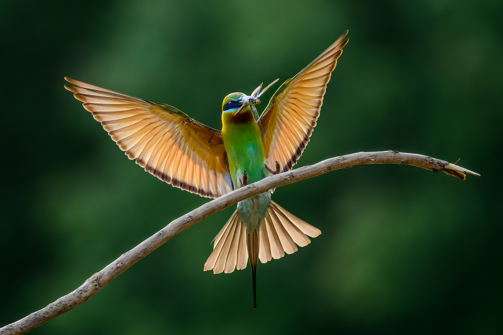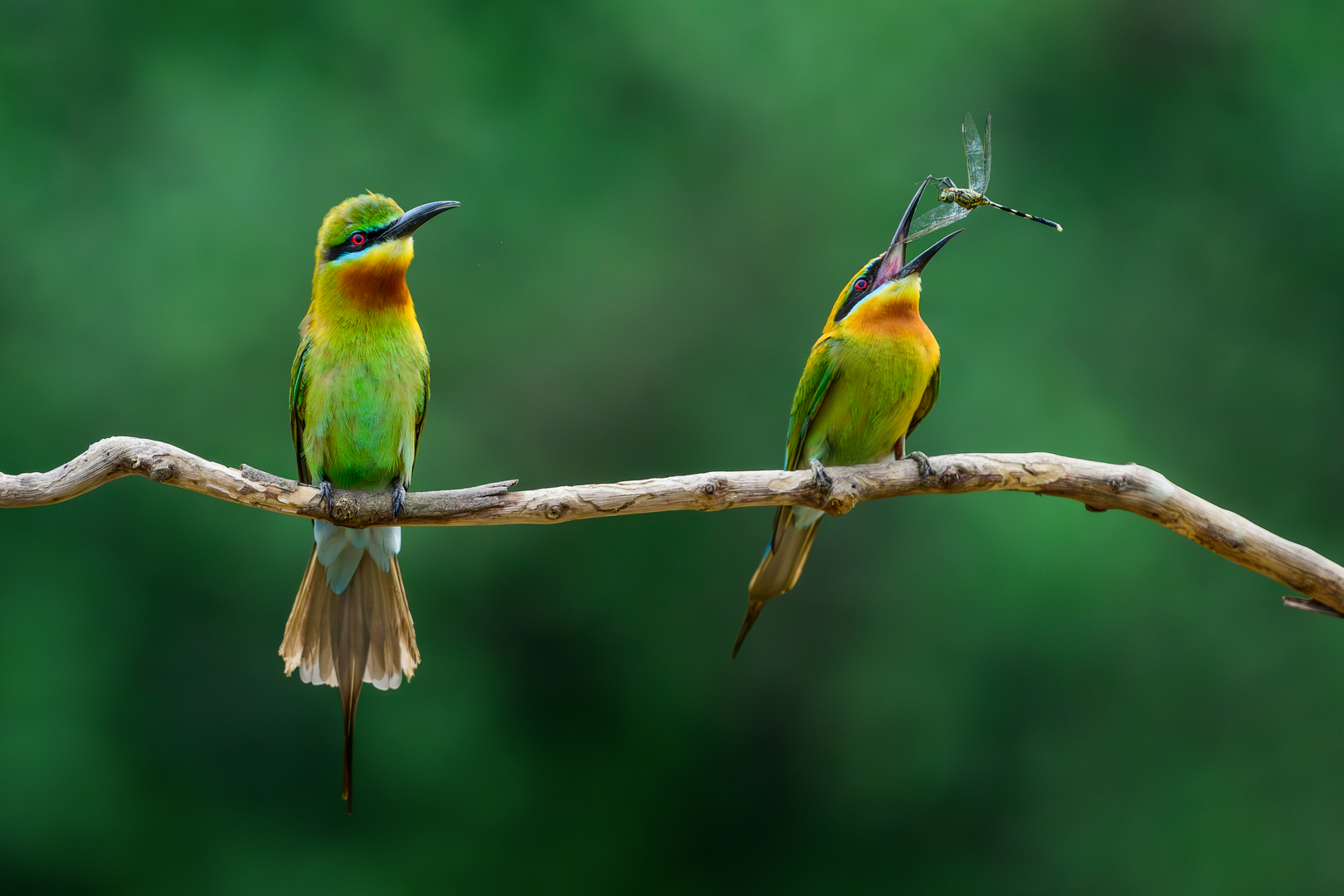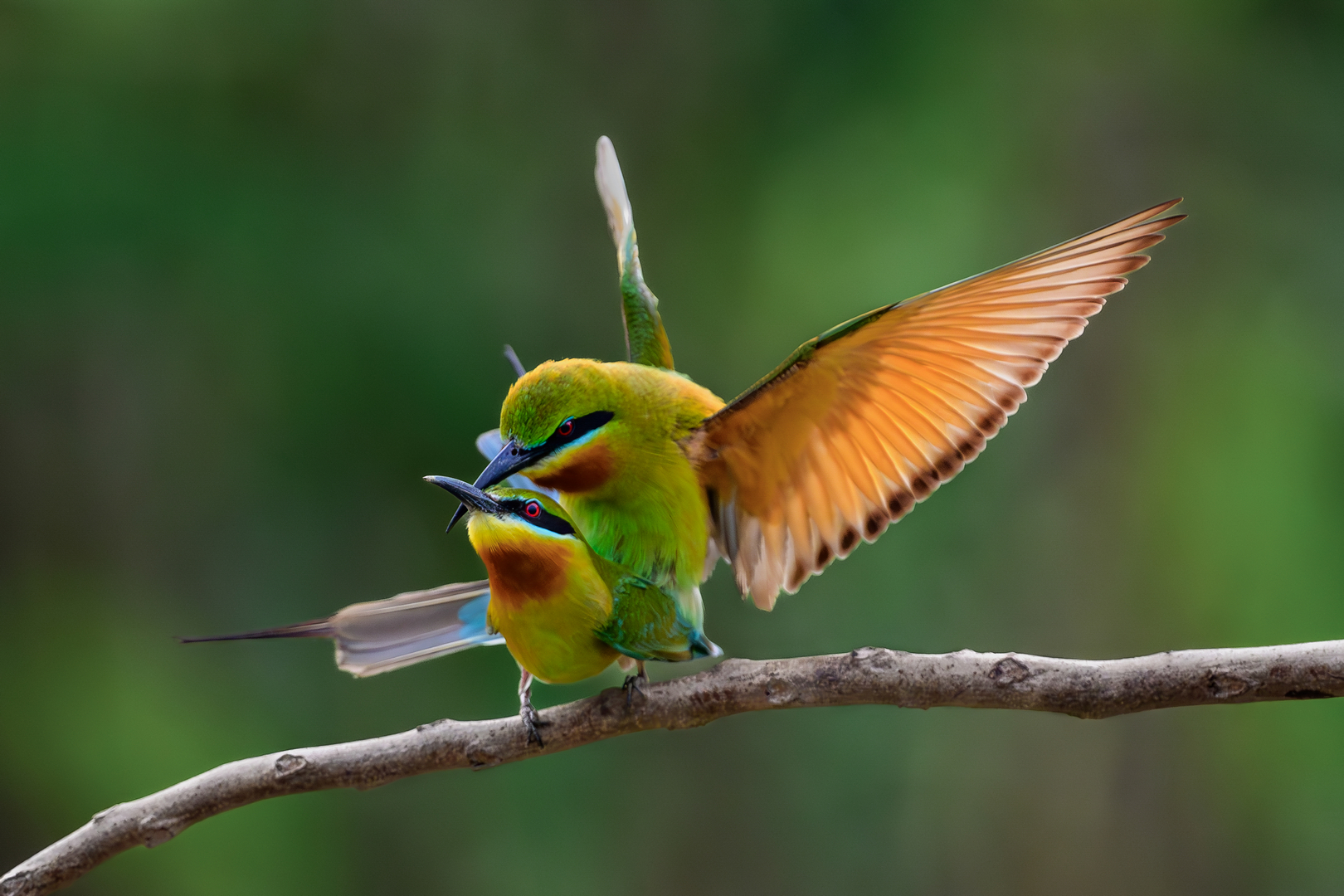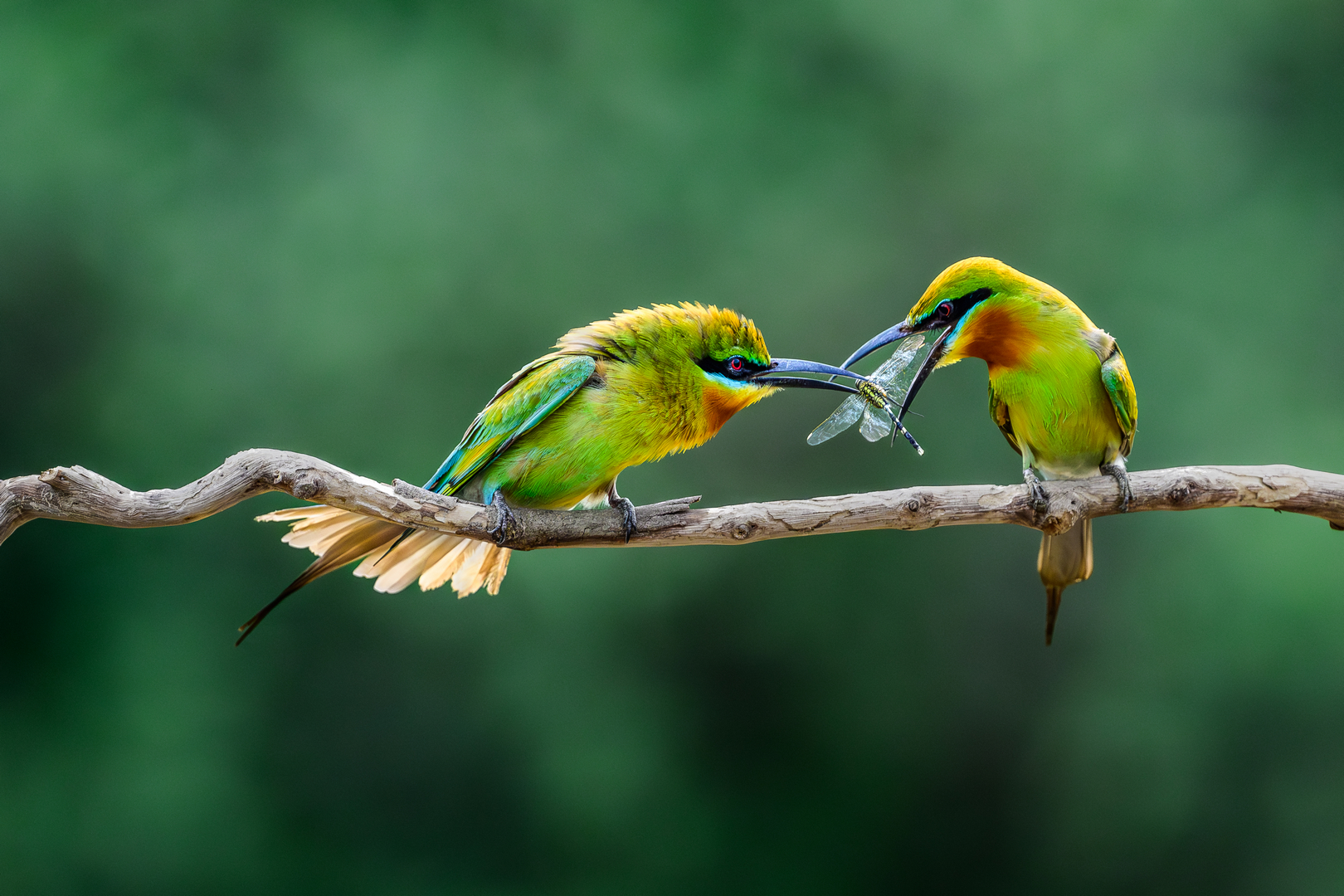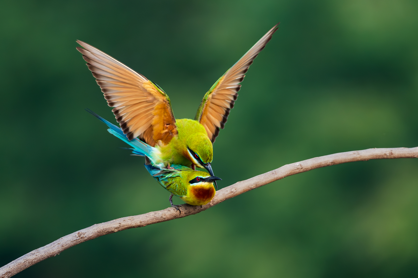 Blue-tailed Bee-eaters perform mating activity, with males offering insects to females. Mating follows successful food exchange, often near nesting sites in sandy banks. Courtship generally found in summer.